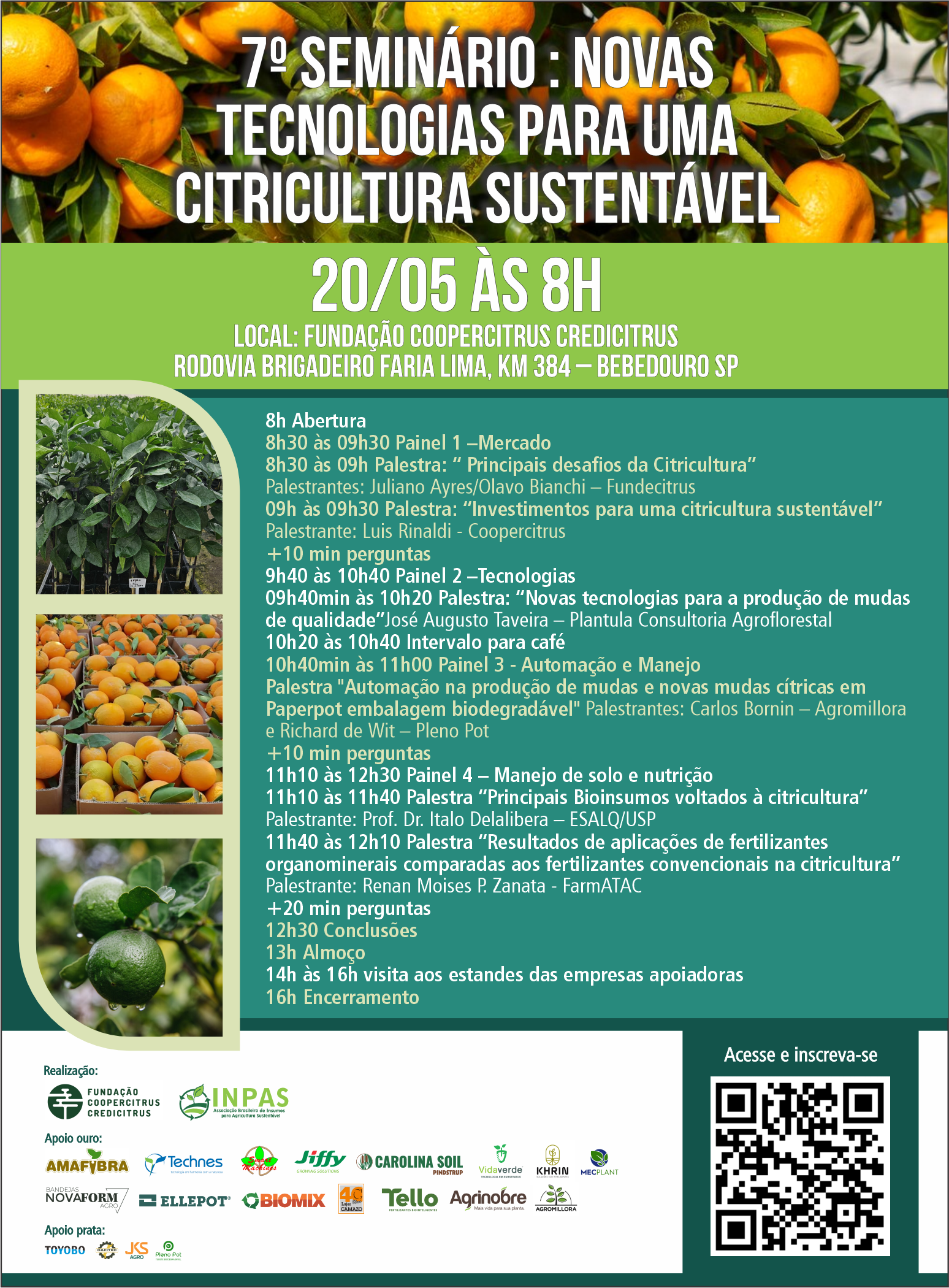 É com grande satisfação que a Associação Brasileira de Insumos para Agricultura Sustentável – INPAS e Fundação Coopercitrus Credicitrus realizarão o 7º seminário “Novas tecnologias para uma citricultura sustentável”, voltado aos citricultores, viveiristas, empresas fabricantes de insumos e profissionais da cadeia, no Auditório da Fundação Coopercitrus Credicitrus, Bebedouro/SP.